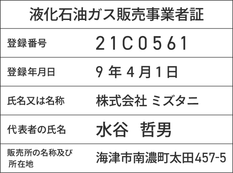 | 認可・登録 | 建設業許可 第13894号 海津市上下水道指定工事店 桑名市下水道指定工事店 液化石油ガス販売事業者 液化石油ガス認定保安機関 パナソニック「住まいパートナーズ」加盟店 |