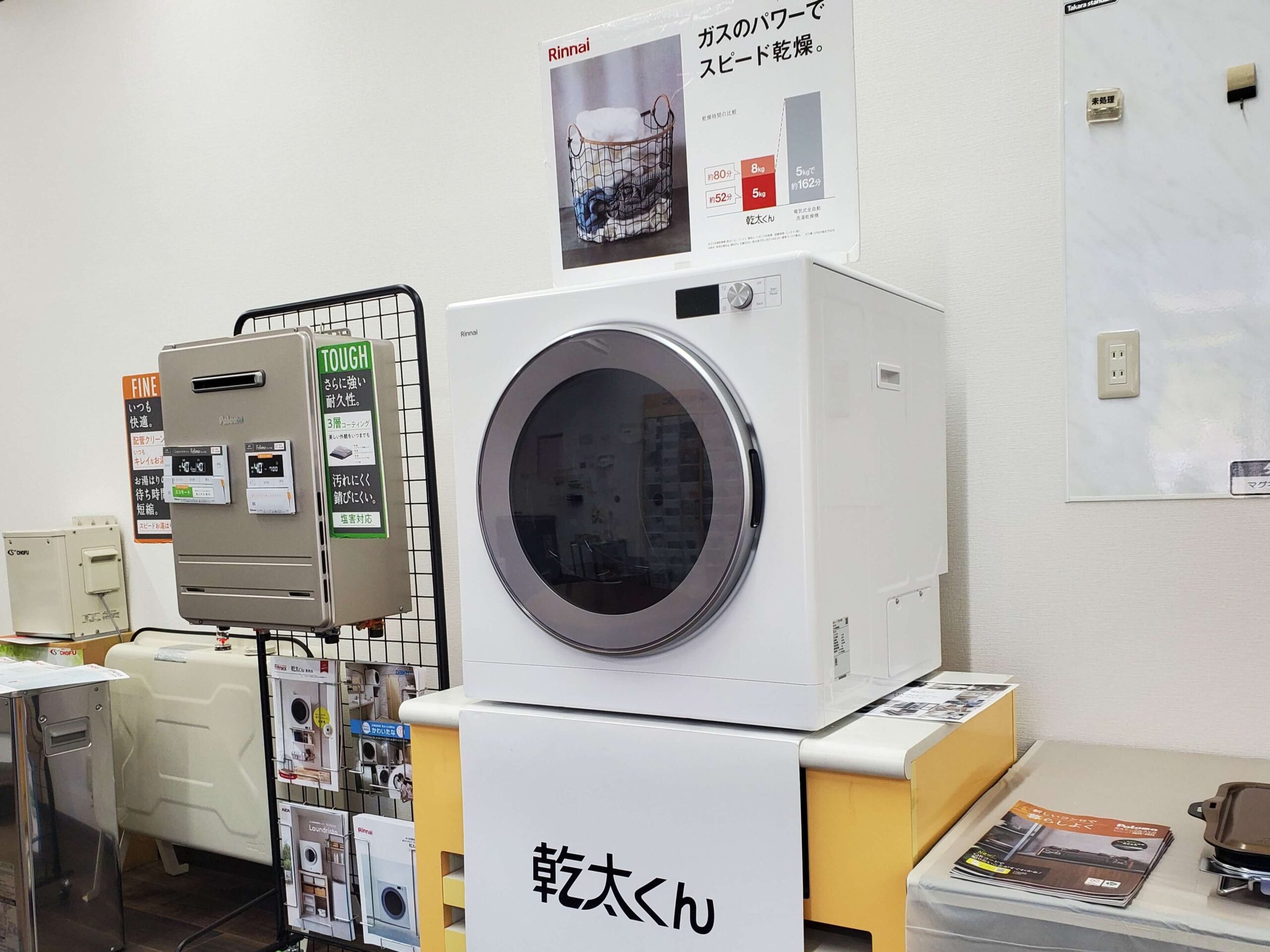 10月にリニューアルした店内には『ガス衣類乾燥機 乾太くん デラックスタイプ9㎏』を設置してあります。