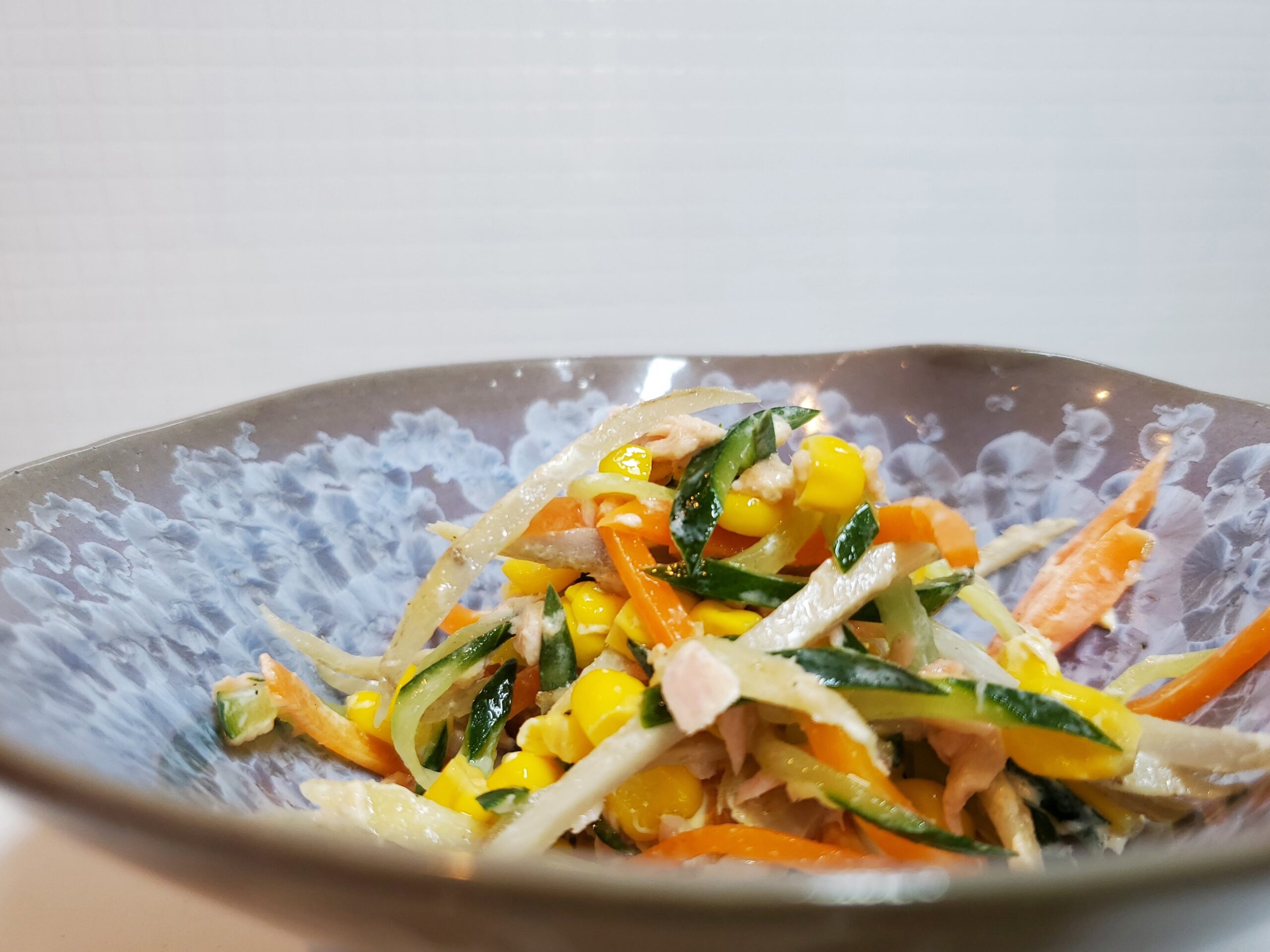 とりあえず、ゴボウとニンジンを千切りにしてゆでました。キュウリも千切りにしました。それらを和えてコーンや豆やツナを加えてサラダにしました。味付けはマヨネーズと塩コショウです。