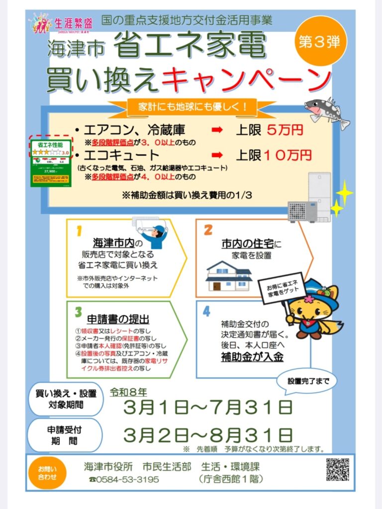 第3弾 海津市省エネ家電買い換えキャンペーンがスタートします✨