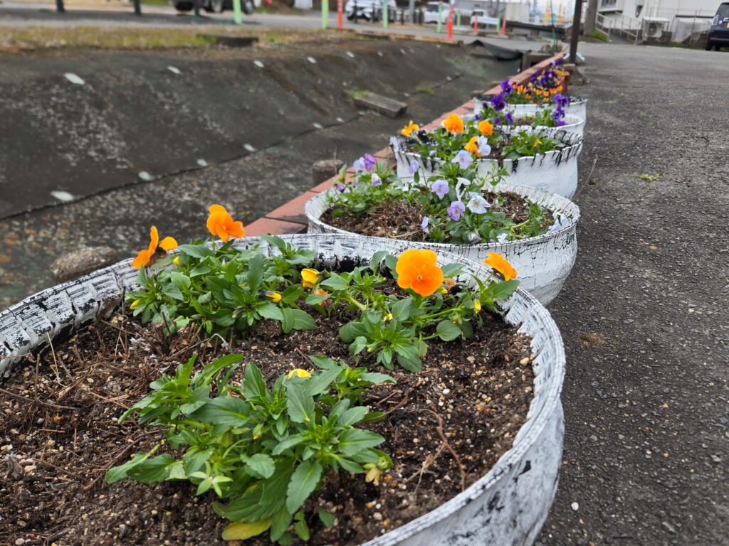 先日、スタッフが店舗前の花壇の花の植え替えをしてくれました。春ですね~。