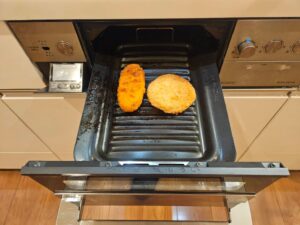 こんにちは嫁のミエです。 揚げ物の温め直しは、グリルで温めるとサクサクが復活するのでオススメです!! よく見たらプレートの汚れが目立つ...笑 グリルの自動…