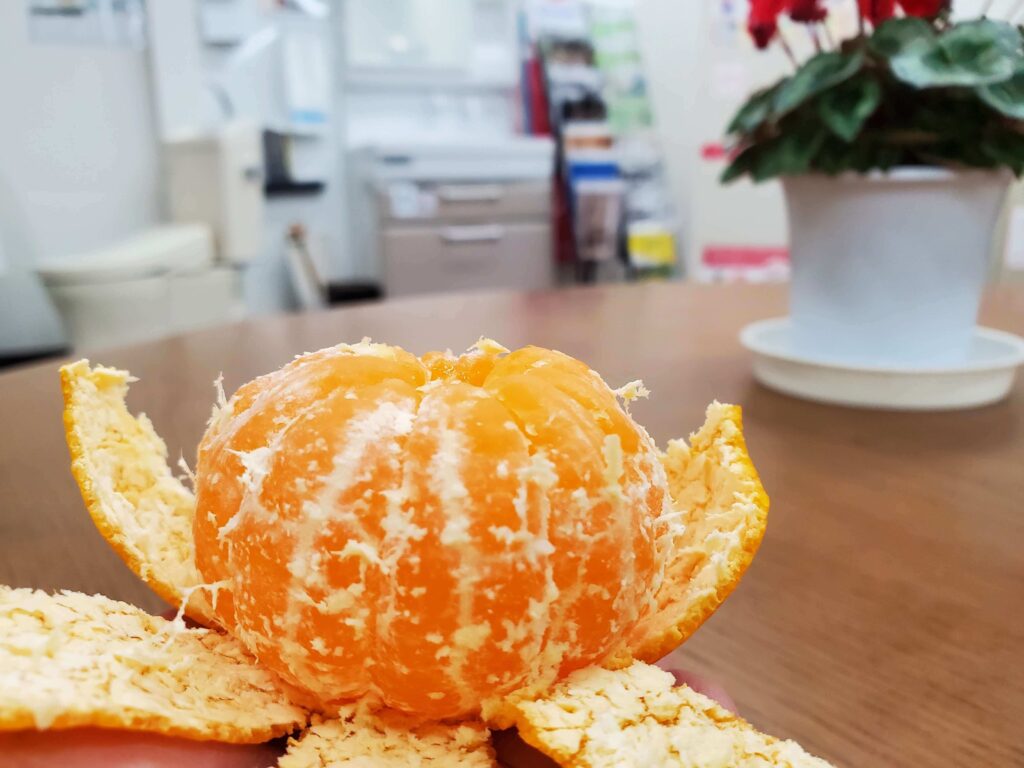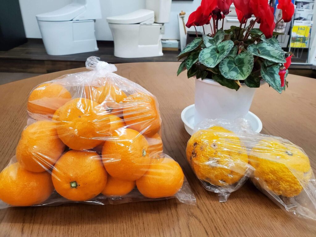 なんと日記を読んでくれたお客さまが朝すぐに店に駆けつけてくれて、「はいっ、今度これでゆず風呂に入って、みかんでも食べて自分の時間も大事にしなさい。自分を労りなさい」と優しい言葉と共にお客さまの畑に成っていた「みかんとゆず」を渡して元気付けてくださったのです。