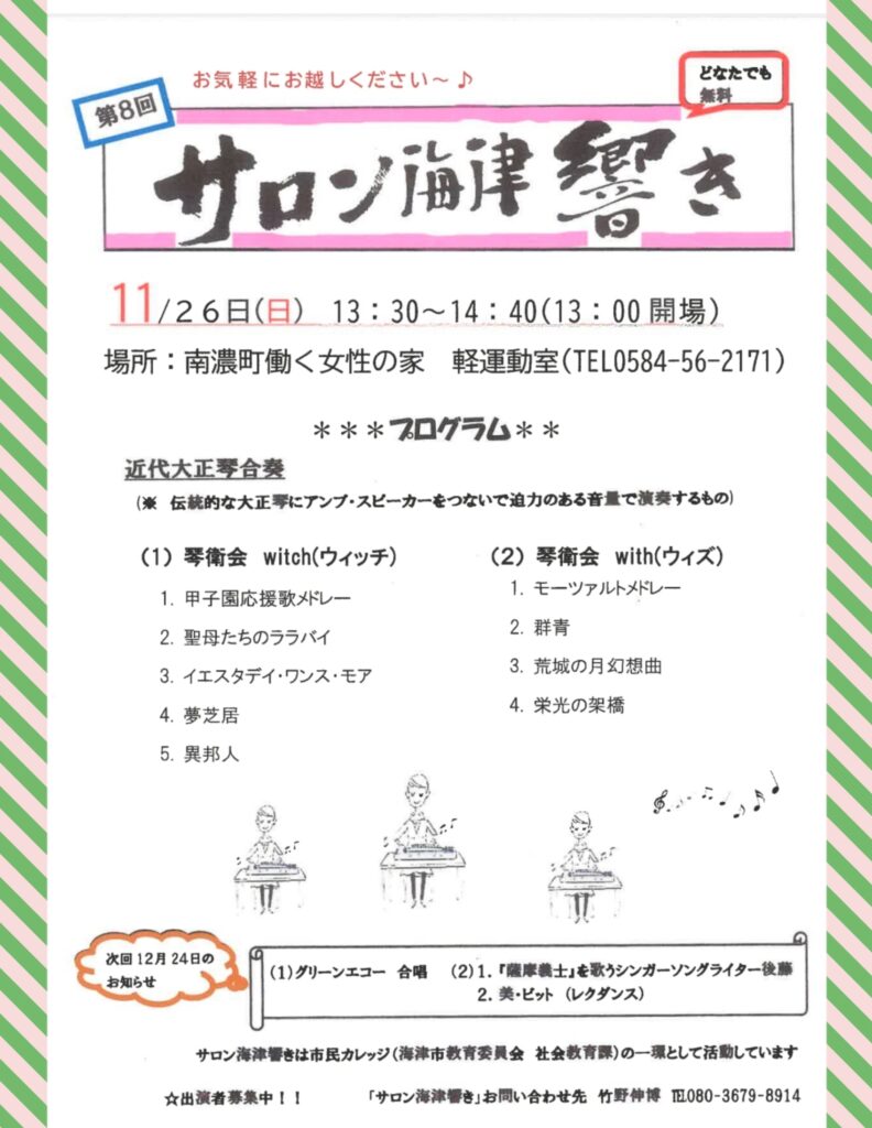 こんにちは嫁のmieです。 11月の『サロン海津 響き』のご案内です。 好きなことを見つけて続けられてて発表する場があって、とてもいいことですね‼ 私も子育てがひと段落したら、何か日常に少し刺激になるようなやりたいことを見つけて活動がで... -
