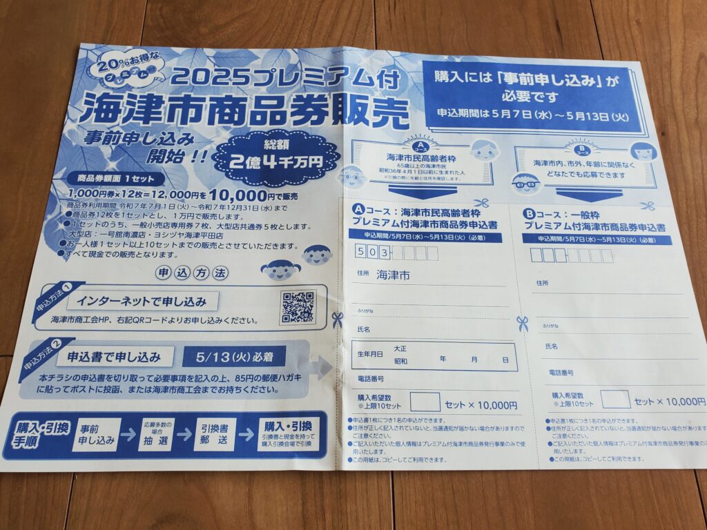 こんにちは嫁のミエです。 昨日の新聞折り込みの中に入ってました。 『2025プレミアム付海津市商品券』 申込期間は5/7(水)~5/13(火) ... -