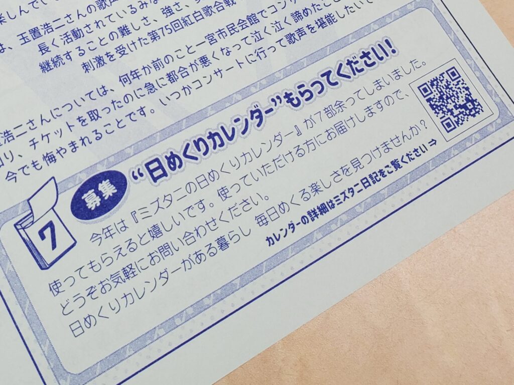 こんにちは嫁のミエです。 ミズタニの今年の日めくりカレンダーの件。 "余っているので使っていただける方にお届けします"と「ミズタニ日記」と「くじら通信」でご案内していました。 そしたら、くじら通信を読んでくださっているお客様たちから、... -