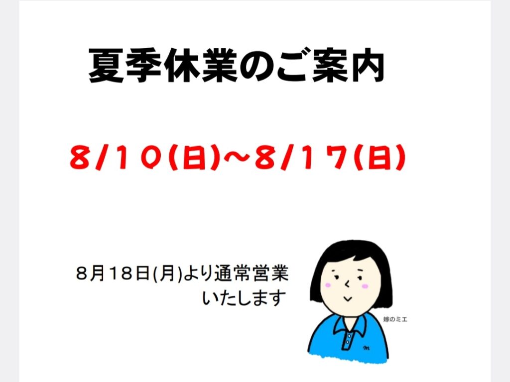 こんにちは嫁のミエです。 日・祝日は定休日です。 今年は、そのまま夏季休業に突入させていただきますので、どうぞよろしくお願いいたします。 夏季休業のご案内 お休みさせていただきます。 なお、ガスの緊急業務につきまして対応させてい... -
