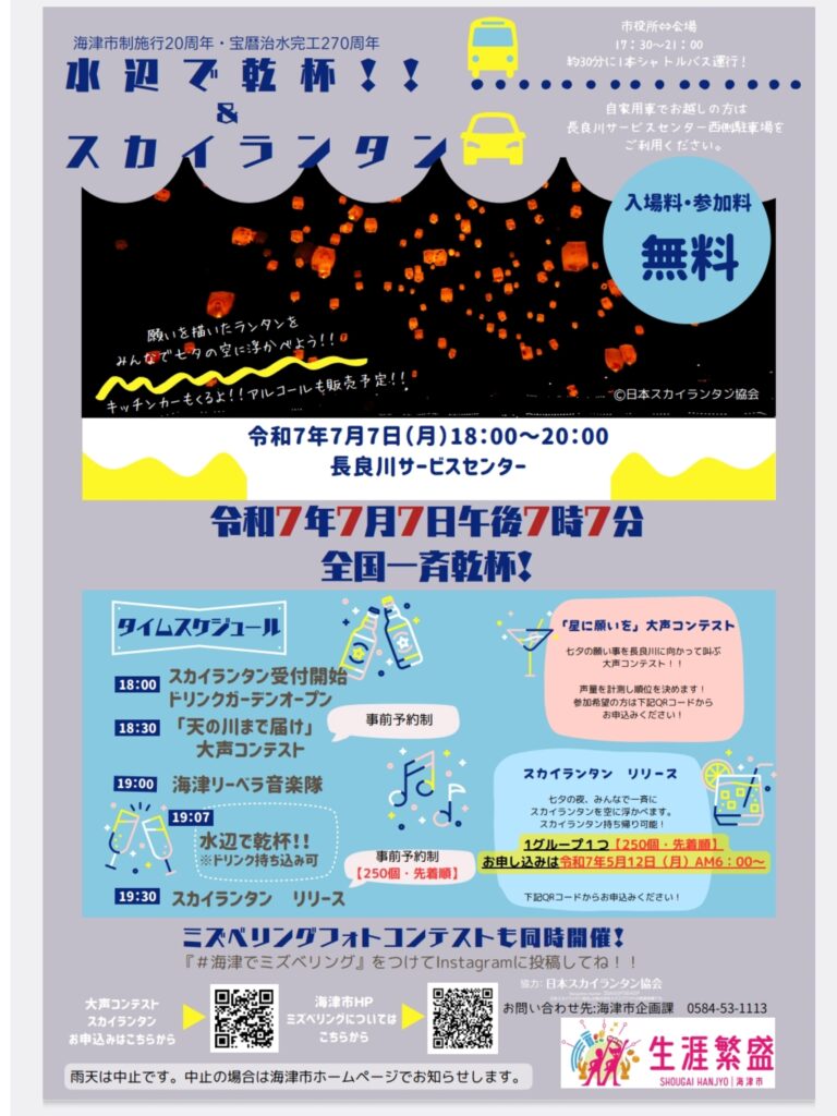 こんにちは嫁のミエです。 令和7年7月7日の今日は、海津市ではスカイランタンのイベントがあります。そして午後7時7分にはみんなで乾杯するんですって✨🍻🎶 楽... -
