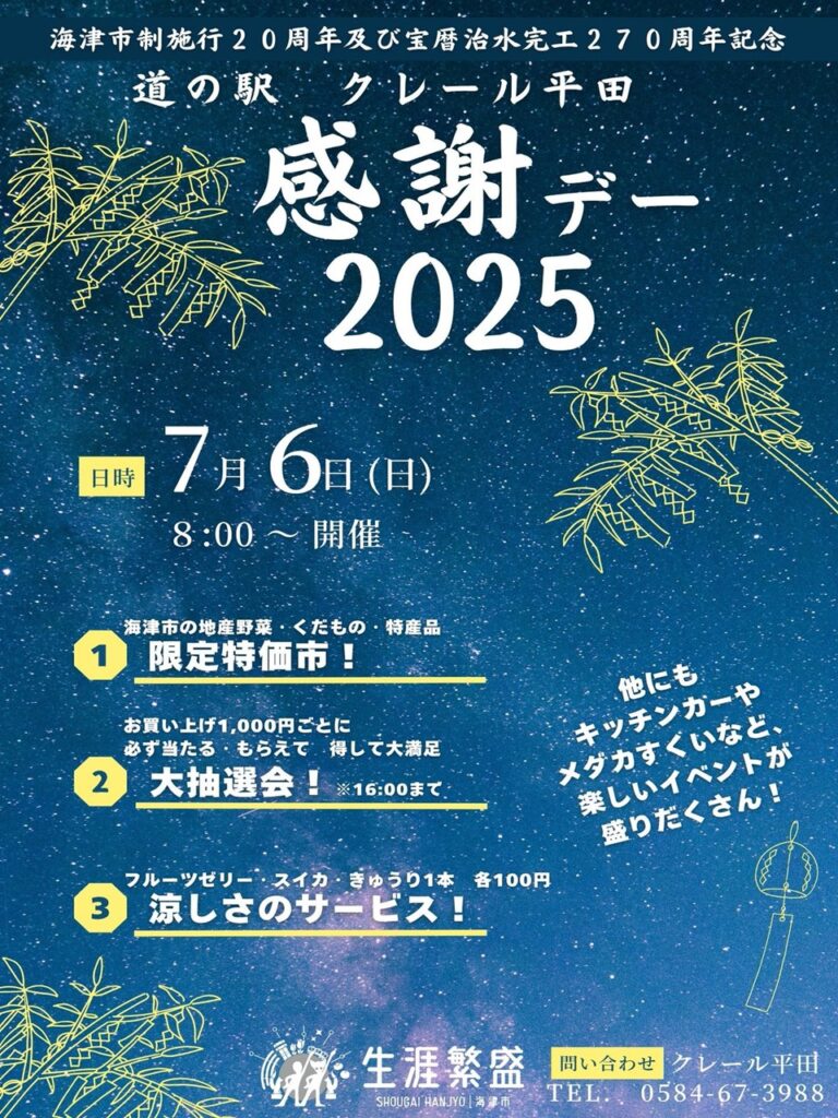 こんにちは嫁のミエです。 海津市内に道の駅が2つありまして、そのうちのひとつクレール平田が本日は感謝デーとのことで、イベントがあります。 ぜひ足を運んでみてください✨ 道の駅というと地元の方々が作った”お野菜”や”くだもの”がいろいろあるので、... -