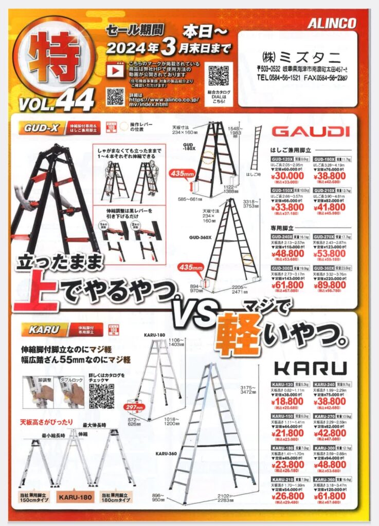 こんにちは嫁のmieです。 いよいよ柿やみかんの収穫シーズンです☺ 収穫時や庭木のお手入れの時『アルミ 三脚脚立』は使いますか??ミズタニでも取り扱ってますので、お気軽にお問い合わせくださいね。 今だとアルインコのアルミ 三脚脚立「2m10cm」... -