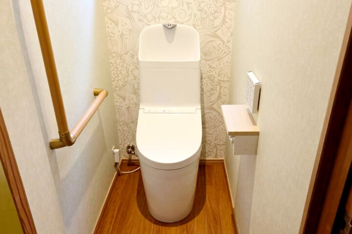 | 工事の 内容 | 「和式なので、かがむのが辛くなってきた。段差もなくしたいので洋式トイレに変えたい」とのご依頼でした。 器具や手すり、天井と壁のクロスをお客様に選んでいただきました。 床工事、クロス貼りの工事は、信頼している地元の職人と連携して対応しております。 |